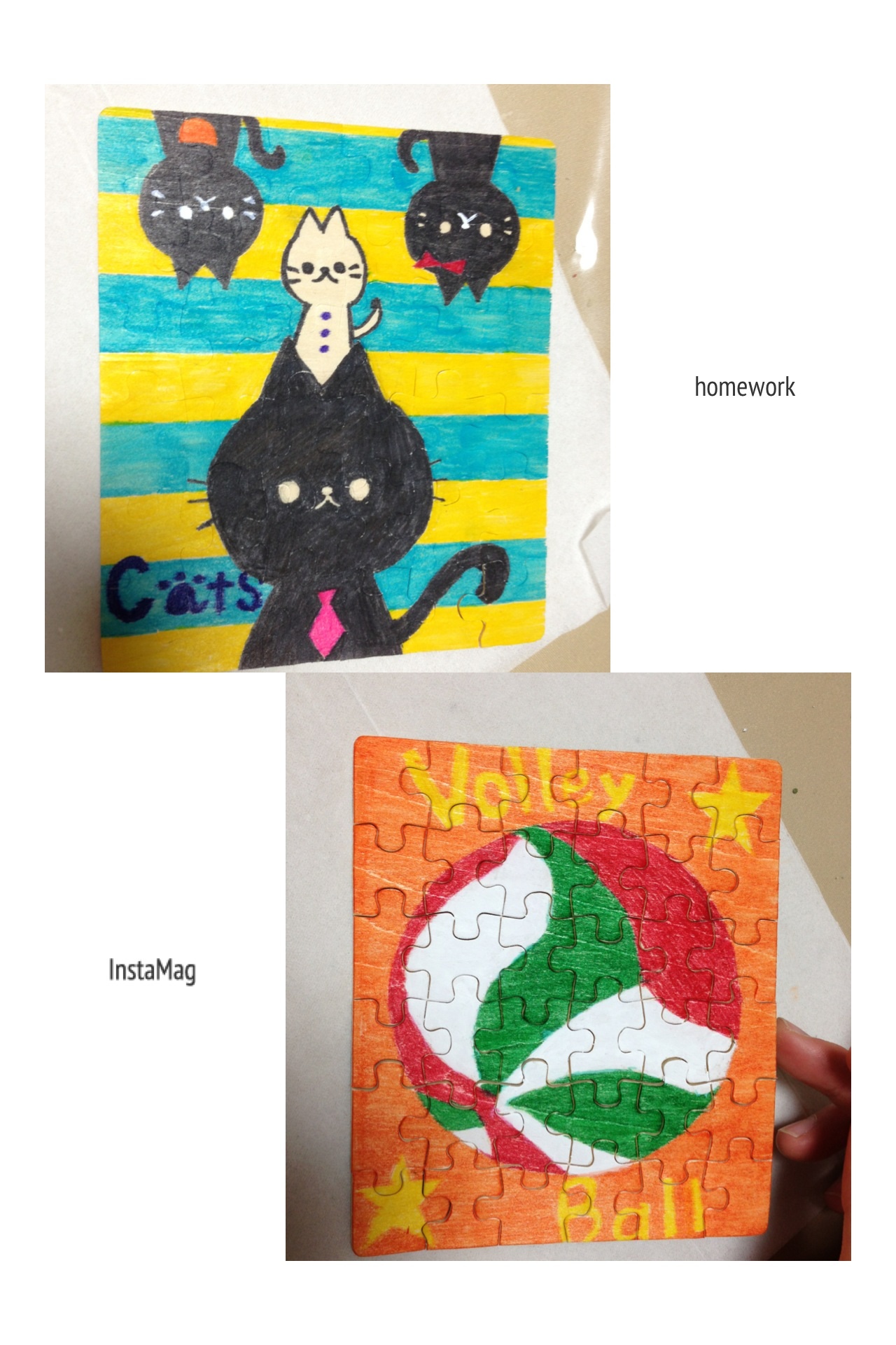 パズルになった板の両面に水性ペンで好きな絵を描くのです。
